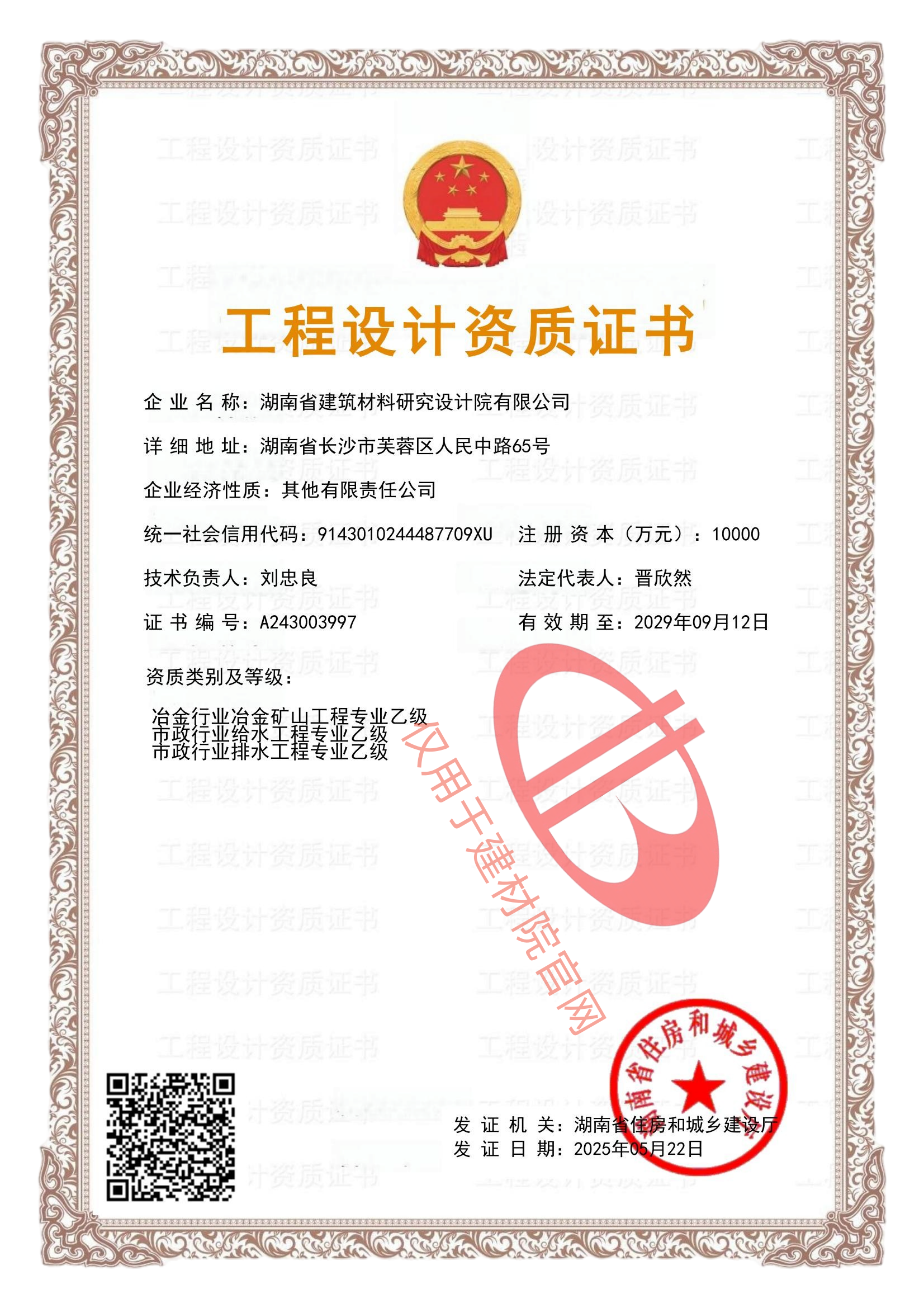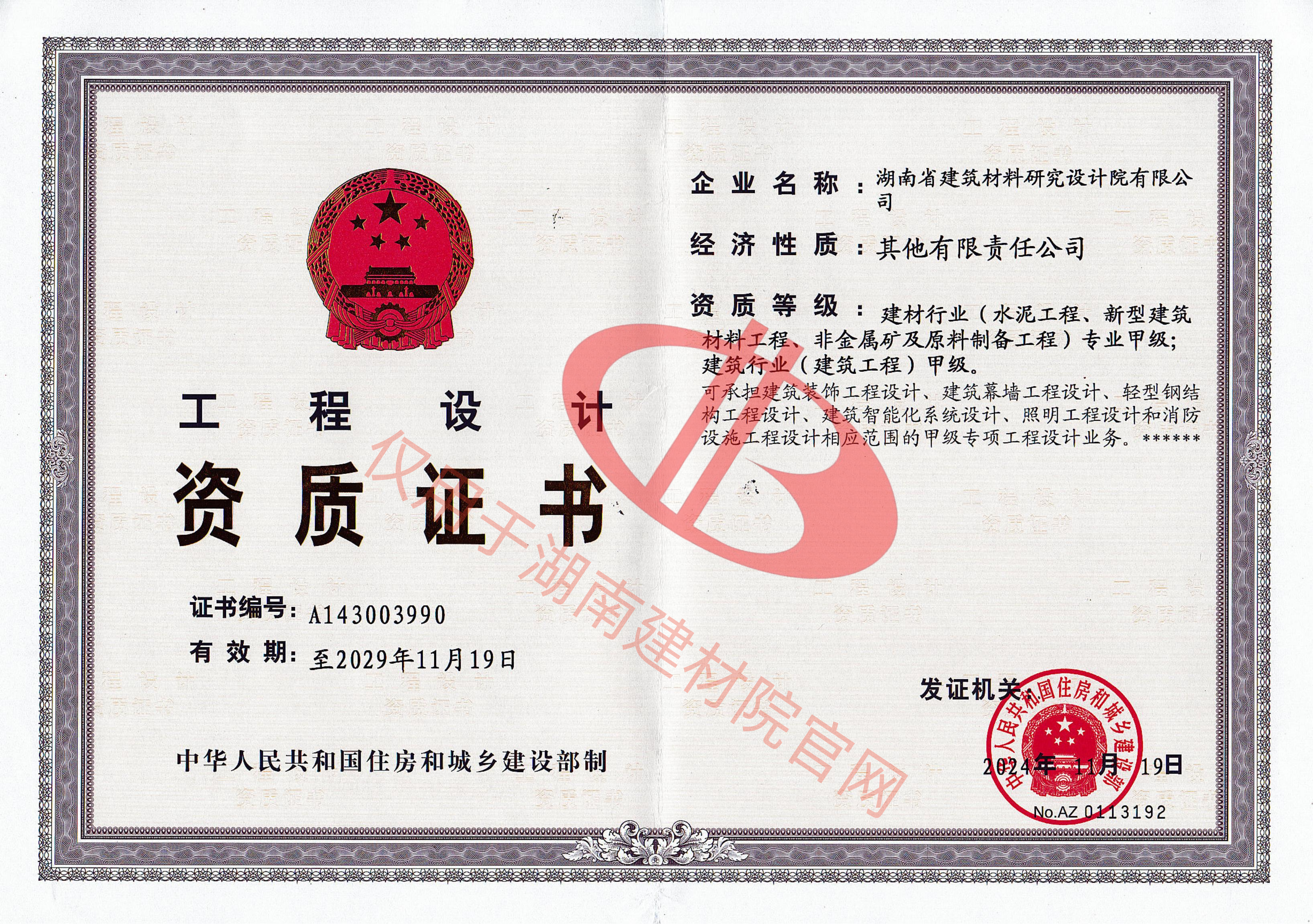 湖南省建筑材料研究設計院有限公司的前身為湖南省建筑材料研究設計院,成立于1958年,是1993年全國首批榮獲國家建材行業設計、工程總承包甲級資質的四個科研設計單位之一。
